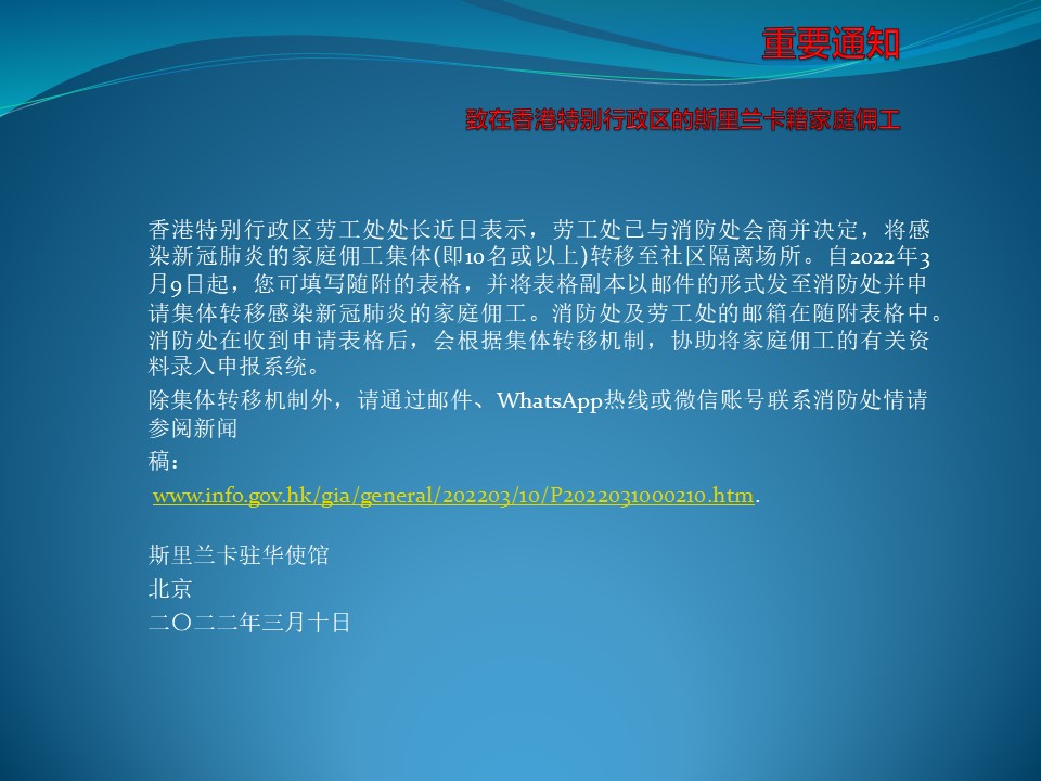 重要通知 致在香港特别行政区的斯里兰卡籍家庭佣工