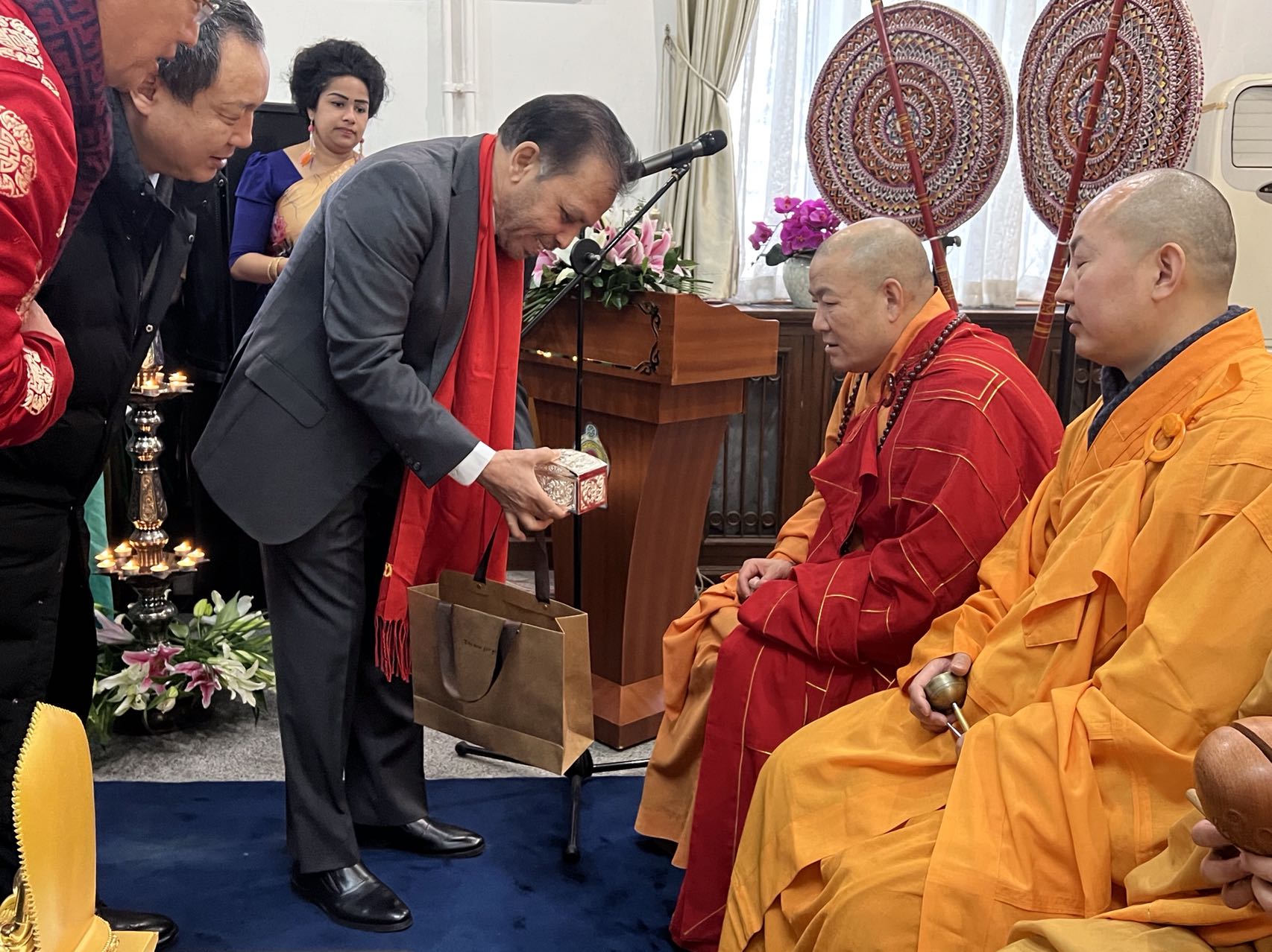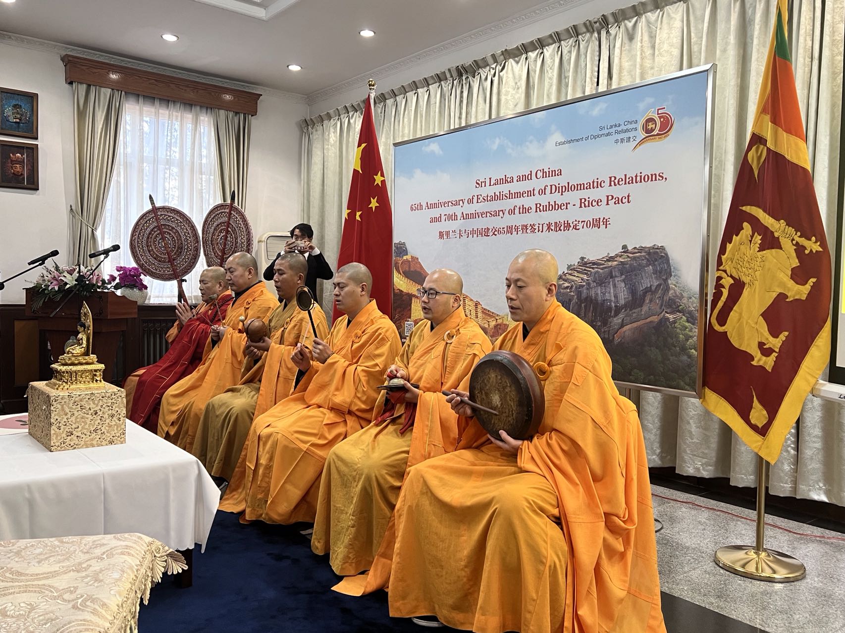 The traditional oil lamp was lit by the Ambassador, Embassy staff and the Sri Lanka community members. This was followed by religious observances conducted by six Buddhist monks from the Lingguan temple, led by the Most Venerable Shi Chang Zang Thero, Vice President of Buddhist Association of China with five other monks.